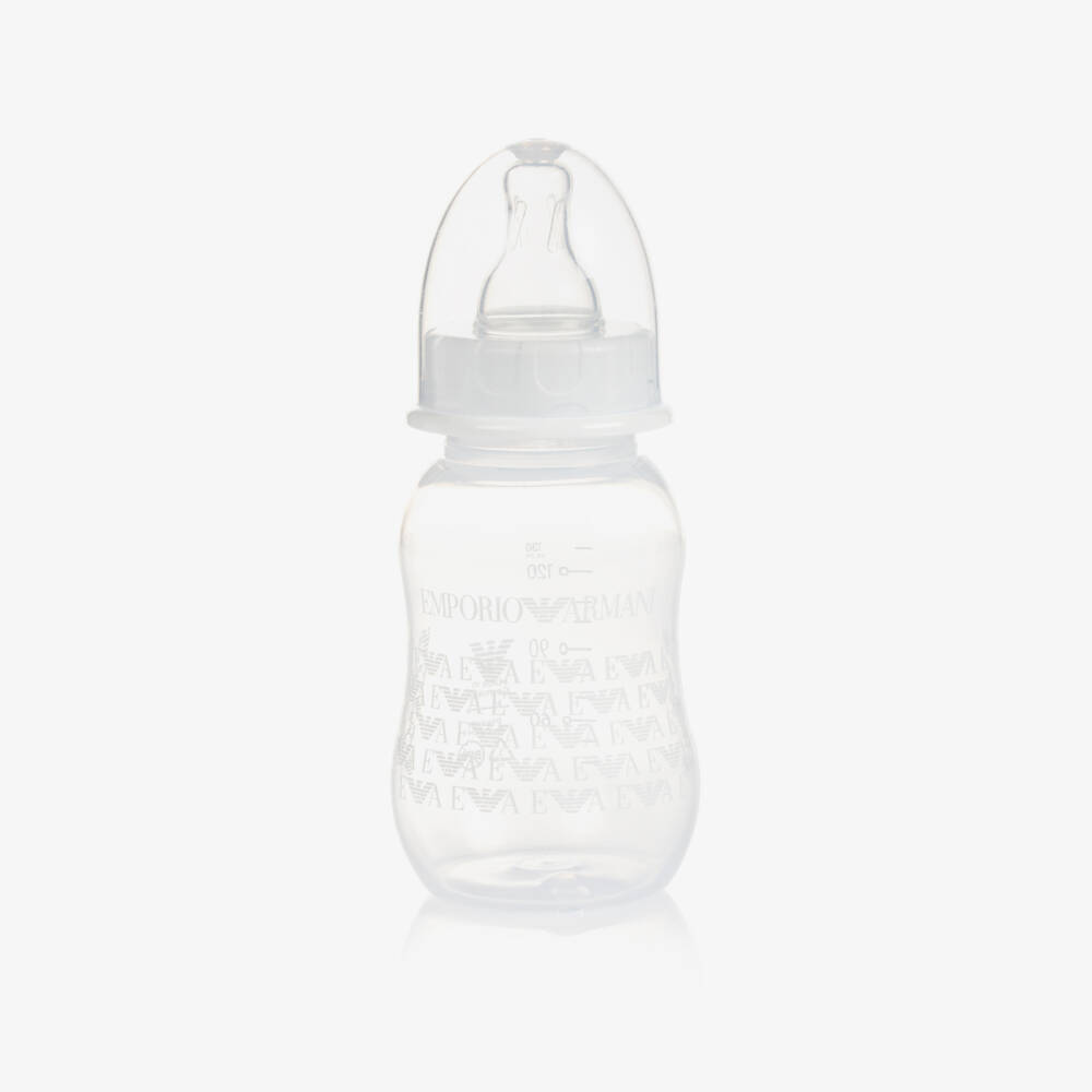 Shatterproof white baby bottle for baby boys and girls by Emporio Armani, with the designer's signature Eagle print. The BPA-free bottle has a 130ml capacity, comes with a silicone teat, and has an easy-grip design.