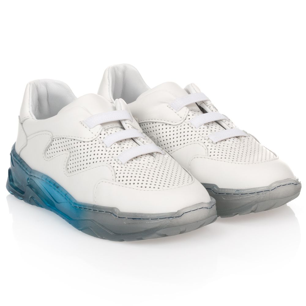 Boys white trainers by Emporio Armani, made in luxuriously soft and supple leather with perforation details. They have a translucent blue rubber outsole with elasticated laces for easy slip-on. There are logo branding on the back.
