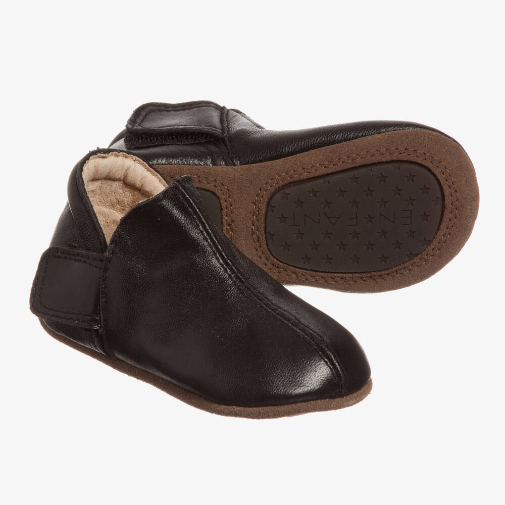 These soft, lightweight and flexible black leather first-walker shoes from En Fant, are perfect for little ones finding their feet. They are fully lined in leather, with suede leather outer soles and rubber grips, and are secured with velcro fastening straps at the sides, allowing them to be pulled wide open for easy access.