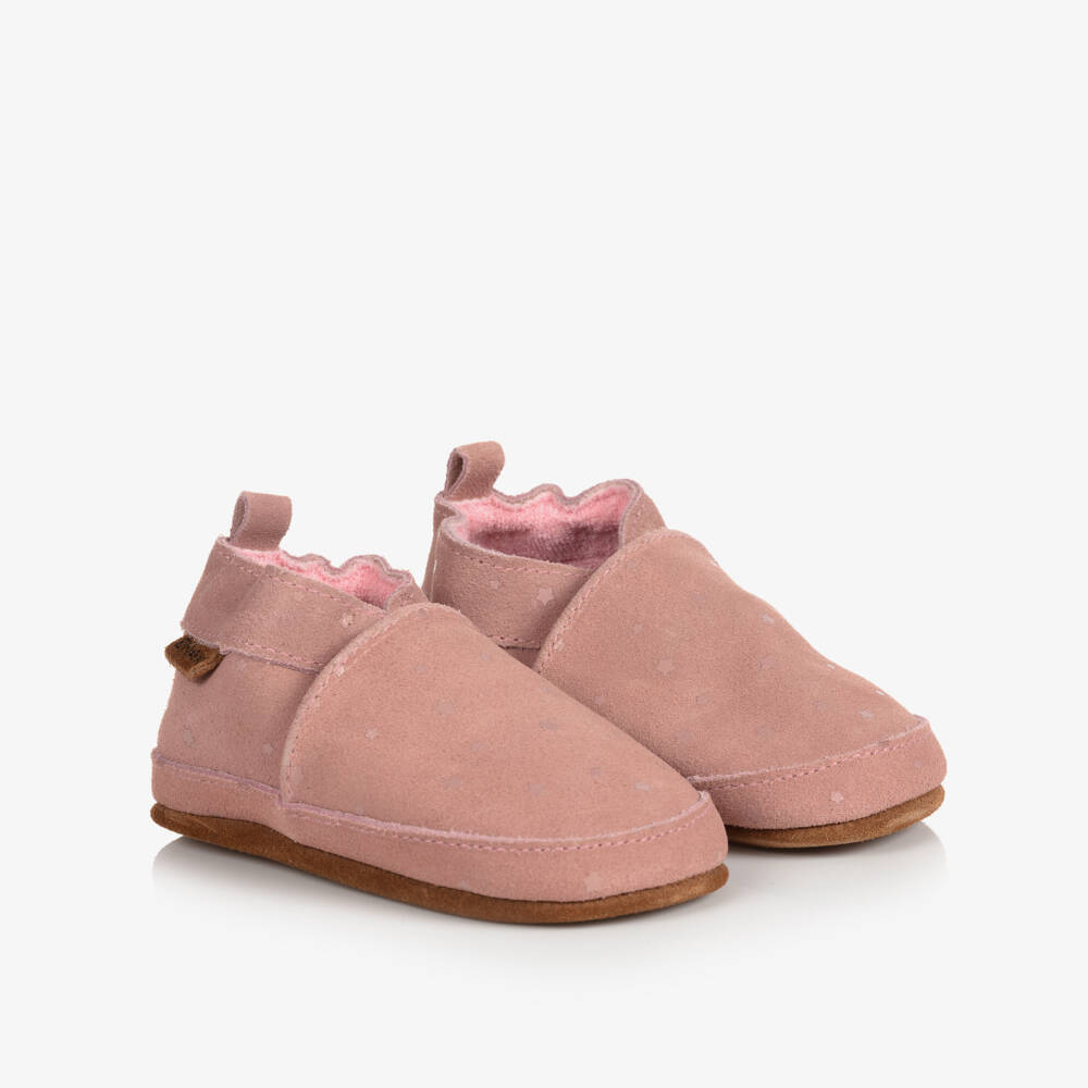 A dusky pink pair of slippers for younger girls by EN FANT, with a tonal star print. Made from beautifully soft and supple suede leather, these comfortable indoor shoes have soft suede soles, ideal for surfaces like wooden floors. Also suitable as a pre-walker shoe for babies, they slip on easily with their stretchy elasticated backs. They are finished with a towelling lining for added comfort.