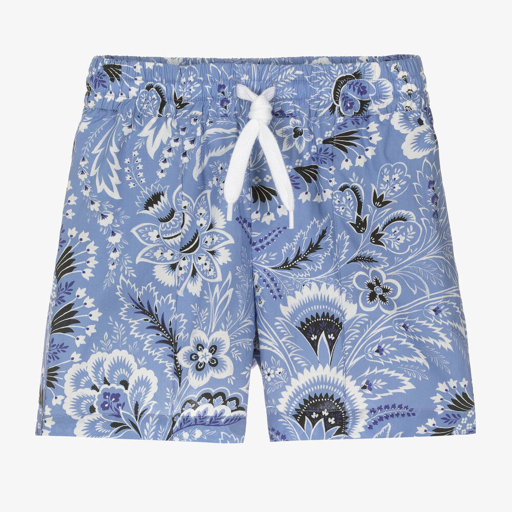 Signature blue shorts for boys by luxury designer Etro, woven in lightweight cotton fabric for warm weather wear. This resort wear piece is designed in a white and dark navy blue floral paisley print, synonymous with the Italian brand's bohemian aesthetic. They have two side pockets and an extra pocket on the back which is embroidered with the white Pegaso logo. The stretchy drawstring waist makes them easy to put on and take off.
