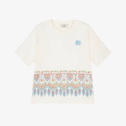 Designed by luxury brand Etro, this ivory T-shirt for boys is simple, stylish and easy to wear. It is made in soft cotton jersey and is printed with a geometric, tile-inspired panel across the chest, with the designer's signature Pegasus logo embroidered in blue.