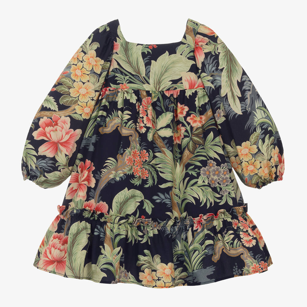 A navy blue dress for girls by luxury Italian designer Etro, made in beautifully soft cotton fabric with a twill lining for extra comfort. Shaped with an empire waist, it has a lovely floral print in botanical shades of green with stand-out accents. This piece is finished with an elegant square neckline, long, puffed sleeves and a zip fastening on the back.