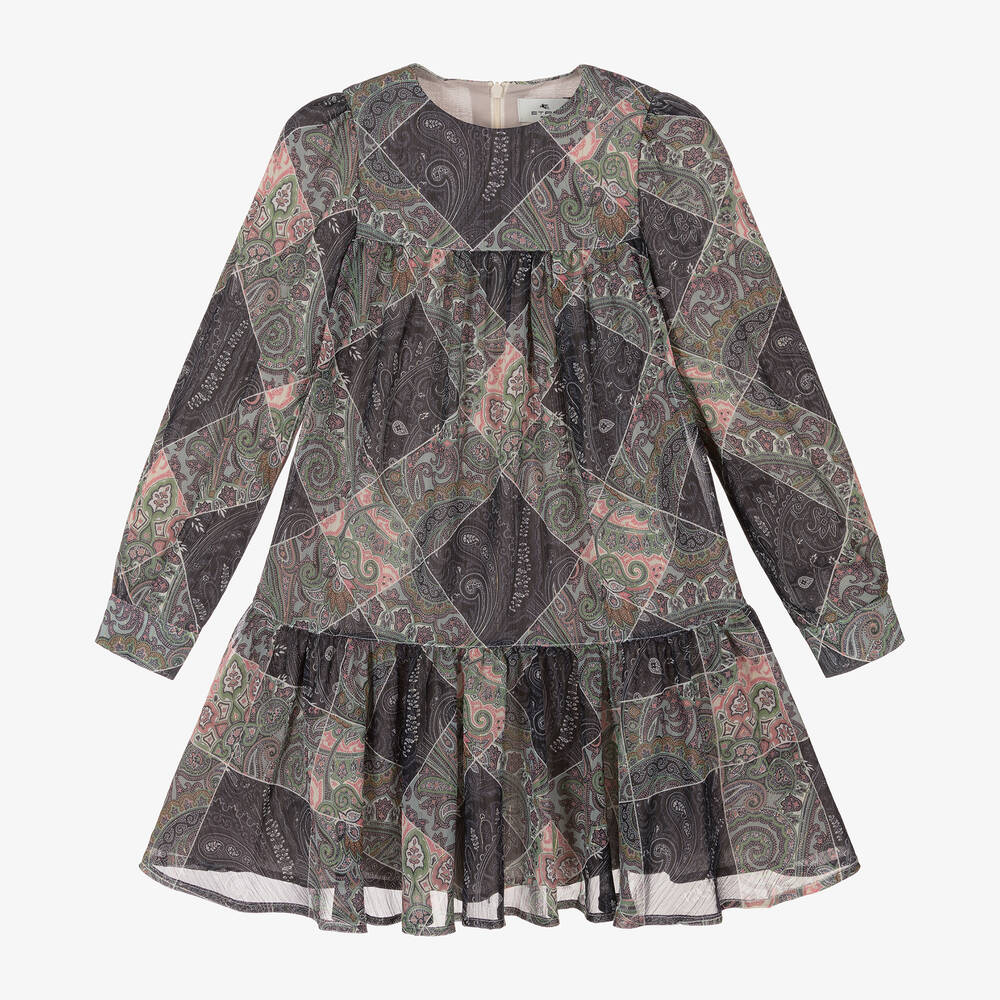 A beautiful dark indigo blue dress for girls by luxury Italian designer Etro, patterned with the brand's signature paisley print, with a touch of shimmering gold thread. The lightweight crêpe chiffon fabric falls beautifully from the bodice and the frilled hemline completes the full and floaty look. It has long sleeves with gentle gathers on the shoulders and branded button fastenings on the cuffs. Fully lined in soft cotton for comfort, the dress fastens neatly on the back with a concealed zip.