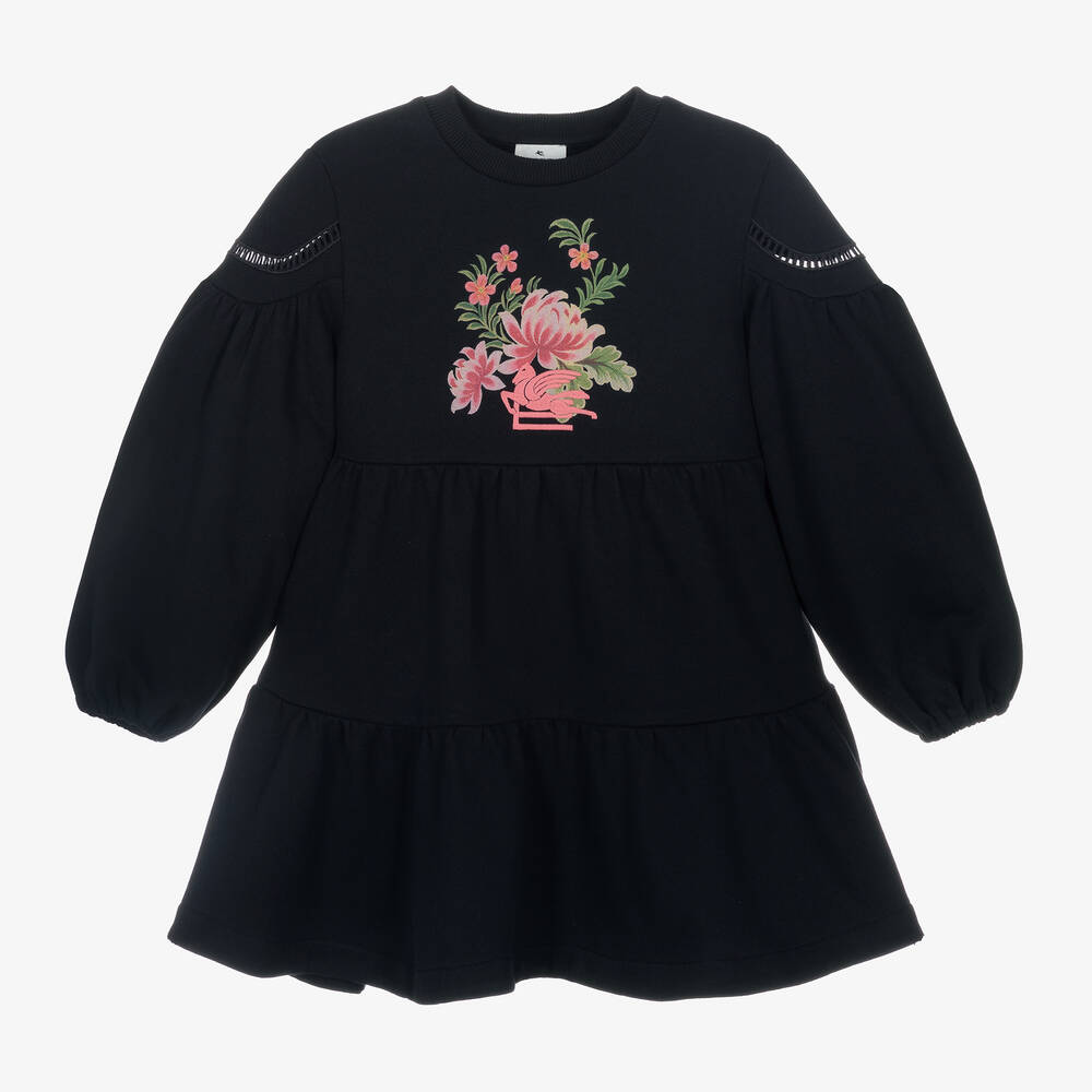 Lovely navy blue dress for girls by luxury designer, Etro. Made in soft cotton jersey, it has long, puffed sleeves with delicate cut-work detailing and a bohemian-inspired, tiered skirt. A pink floral motif on the chest adds a pop of colour to the look, whilst the embroidered pink Pegasus emblem adds a signature branded touch.