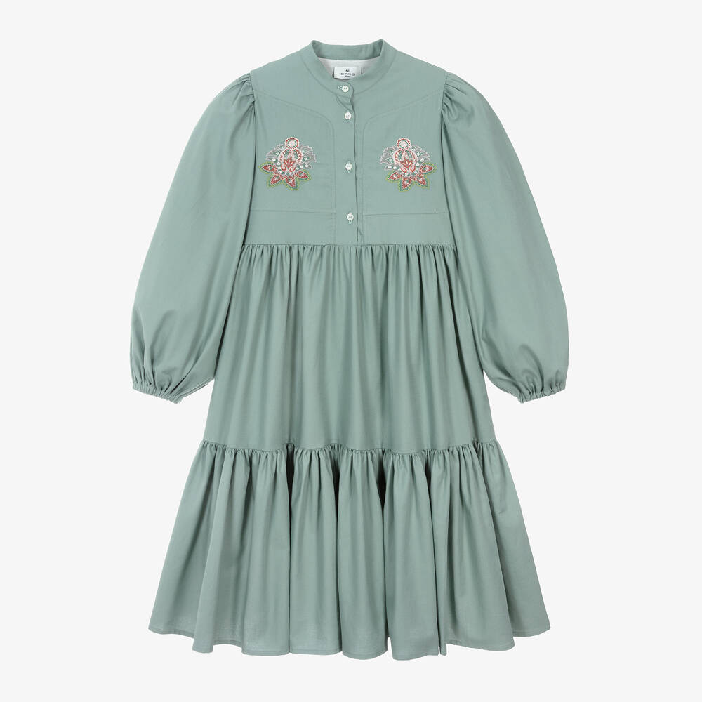 A beautiful sage green dress for girls by luxury Italian designer Etro, made in soft cotton twill with a comfortable lightweight lining. This long-sleeved piece is delicately embroidered with deep pink and green flowers on the bodice. It has branded button fastenings on the chest and elasticated cuffs for extra comfort. The puff shoulders and high neckline complete the modest midi style.