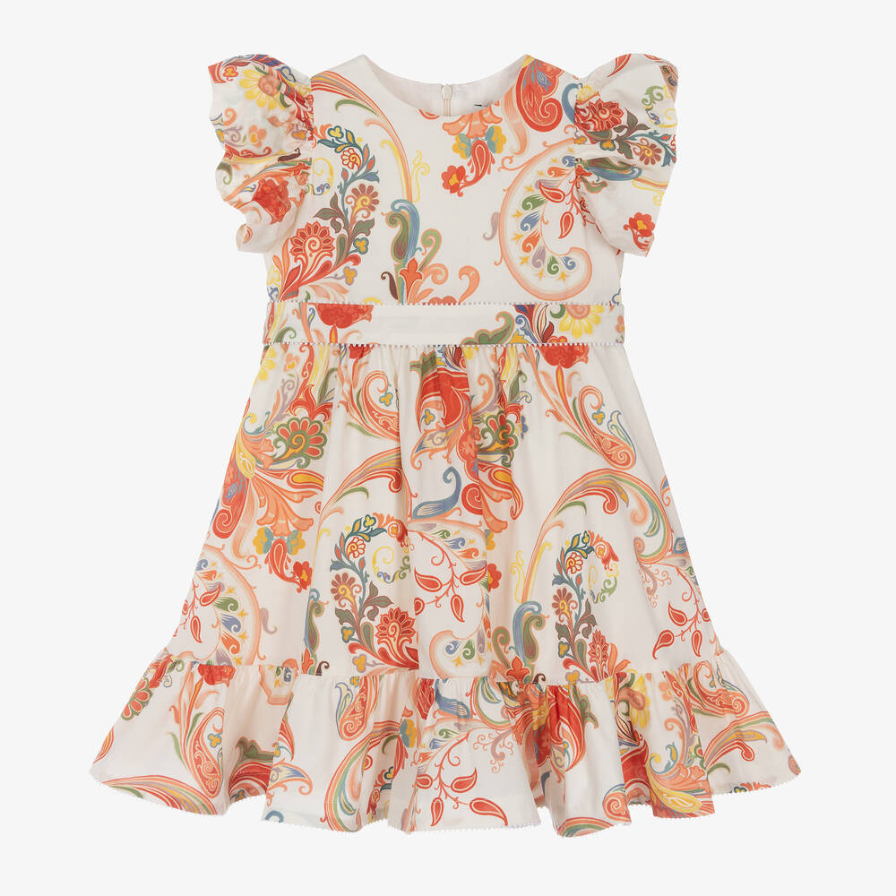 A beautiful ivory dress for girls by luxury Italian brand Etro, made in soft cotton poplin for a lightweight feel. Lovely for resort wear, this short-sleeved dress is patterned with the designer's signature paisley print in swirling shades of orange, yellow and green. It is fully lined with soft cotton fabric and fastens on the back with a zip. This piece is neatly finished with picot trims, adding delicate detailing around the waistline and hem.