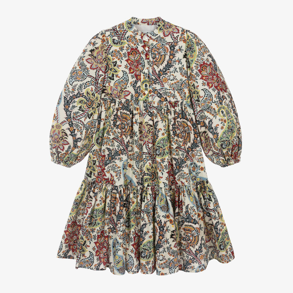 A beautiful ivory dress for girls by luxury Italian designer Etro, made in a pure cotton composition with a soft and lightweight lining. This long-sleeved piece is patterned with a signature paisley print in swirling shades of navy blue and red with vibrant yellow accents. It has branded button fastenings on the chest and elasticated cuffs for extra comfort. The puff shoulders and high neckline complete this tiered, midi dress.