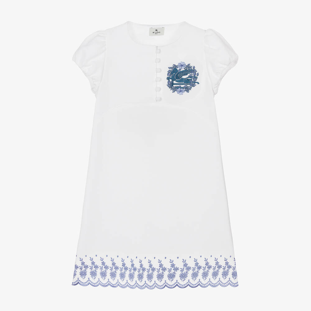 From luxury designer Etro, this white cotton dress for girls is woven in lightweight fabric with a small textured diamond pattern. Fully lined with cotton voile, this smart-casual piece has an embroidered, scalloped hem with pretty blue flowers and placed polka dots. The Italian brand's signature Pegaso logo is embroidered on the chest in deep blue, encircled by two-tone florals. The short sleeves gather on the shoulder and cuff for a fuller look and the bodice is neatly finished with fabric-covered buttons.