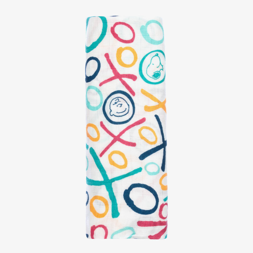 Extra large muslin square for baby boys and girls by Etta Loves Peanuts. Made in soft, lightweight bamboo viscose, it has a colourful 'Peanuts' print. The shapes, colours and patterned prints are uniquely designed by experts in children's vision. These stimulate babies and support their vision and sensory development. The large size makes it ideal as a swaddle from birth, and as a useful cloth or comforter as baby grows