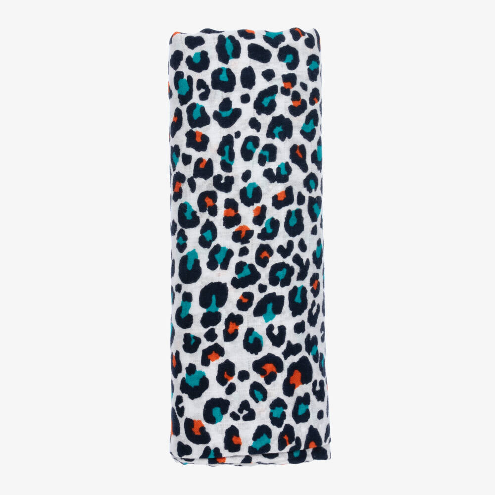 Extra large muslin square for baby boys and girls by Etta Loves. Made in soft, lightweight organic cotton muslin, it has a black, green and orange leopard print. The shapes, colours and patterned prints are uniquely designed by experts in children's vision. These stimulate babies and support their vision and development. The large size makes it ideal as a swaddle from birth, and as a useful cloth or comforter as baby grows.