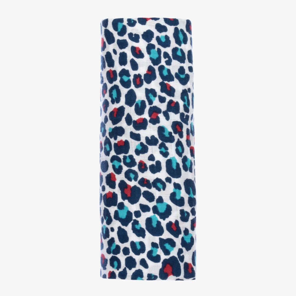Extra large muslin square for baby boys and girls by Etta Loves. Made in soft, lightweight organic cotton muslin, it has a navy blue, turquoise and red leopard print. The shapes, colours and patterned prints are designed by experts in children's vision. These stimulate babies and support their vision and sensory development. The large size makes it ideal as a swaddle from birth, and as a useful cloth or comforter as baby grows