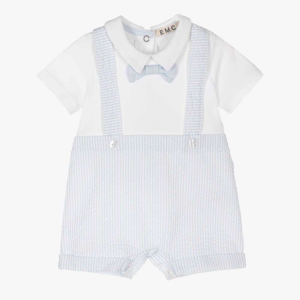 An adorable blue and white shortie for baby boys by Everything Must Change. The jersey bodice has a sweet pointed collar and a pale blue bow tie attached to the chest. The lower body is made in soft, striped seersucker with decorative buttons on the waist and fixed shoulder straps on the front. There are practical popper fastenings on the back and between the legs to help when getting your little one ready for the day.