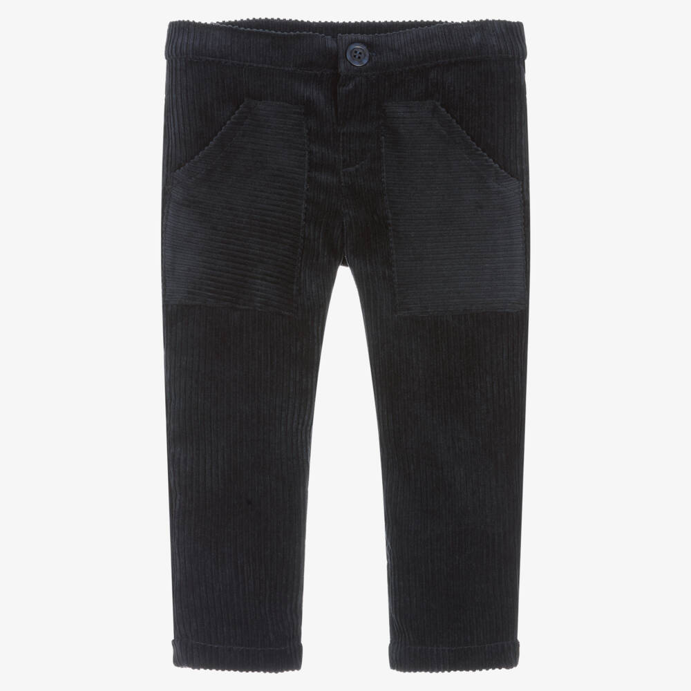 Navy blue trousers for boys by Everything Must Change, made in soft and comfortable corduroy. They fasten with a button on the front and have an adjustable waist for a good fit. There are useful patch pocket on the front.