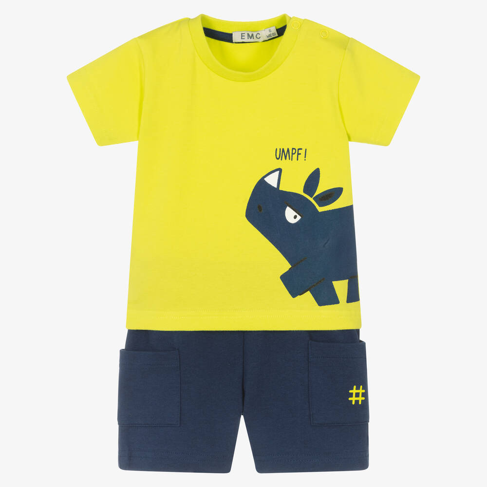 Lime green and navy blue shorts set for younger boys by Everything Must Change, made in soft cotton jersey. A fun, casual outfit, the T-shirt has a blue rhino print on the front, with 'UMPF!' printed above. In an easy pull-on style, the shorts have front patch pockets, one of which is detailed with a coordinating hash symbol.
