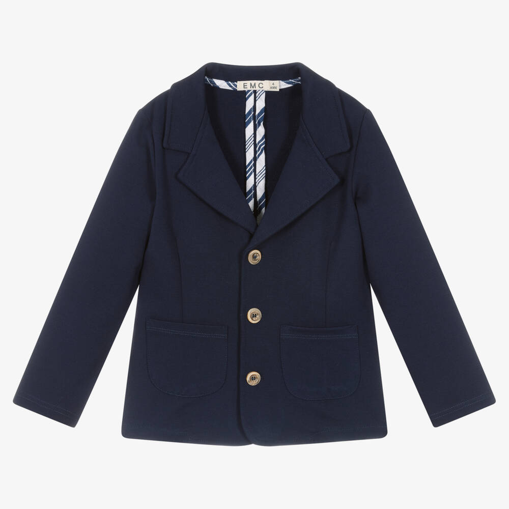 Navy blue blazer for little boys by Everything Must Change, made in soft and comfortable Milano jersey. Classically styled, this smart jacket has a revere collar, front patch pockets and wooden effect buttons.