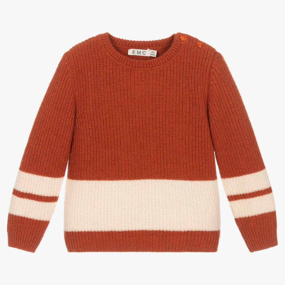 Boys deep orange and ivory sweater by Everything Must Change, knitted in a super soft wool blend with a hint of cashmere. Comfortable to wear, this cosy sweater has button fastenings on one shoulder to help with dressing.