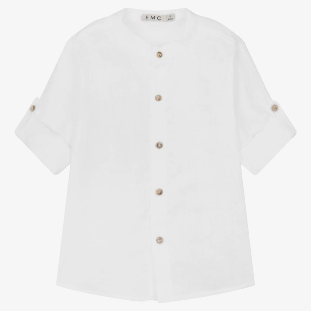 In a classic collarless style, this white linen shirt for little boys is from Italian brand, Everything Must Change. Lightweight and relaxed for warm-weather styling, it has natural button fastenings down the front, and roll-up sleeves that secure with buttons.