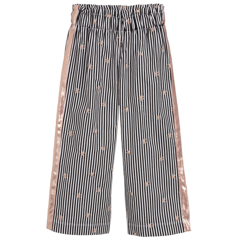 Girls black and white striped culottes from Everything Must Change, with a gold star pattern. They are made in a lightweight fabric, with sparkly gold stripes on the sides and an elasticated waistband.