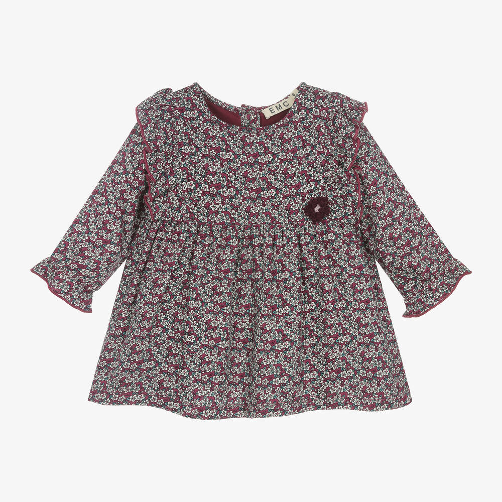 A pretty burgundy red dress for younger girls by Everything Must Change, made in soft viscose for a gentle feel. It is patterned with white and blue florals and finished with a crochet flower appliqué on the front. There are lovely frill details on the shoulder and elasticated cuffs on the long sleeves. The dress is lined with comfortable cotton jersey and fastens on the back with poppers.