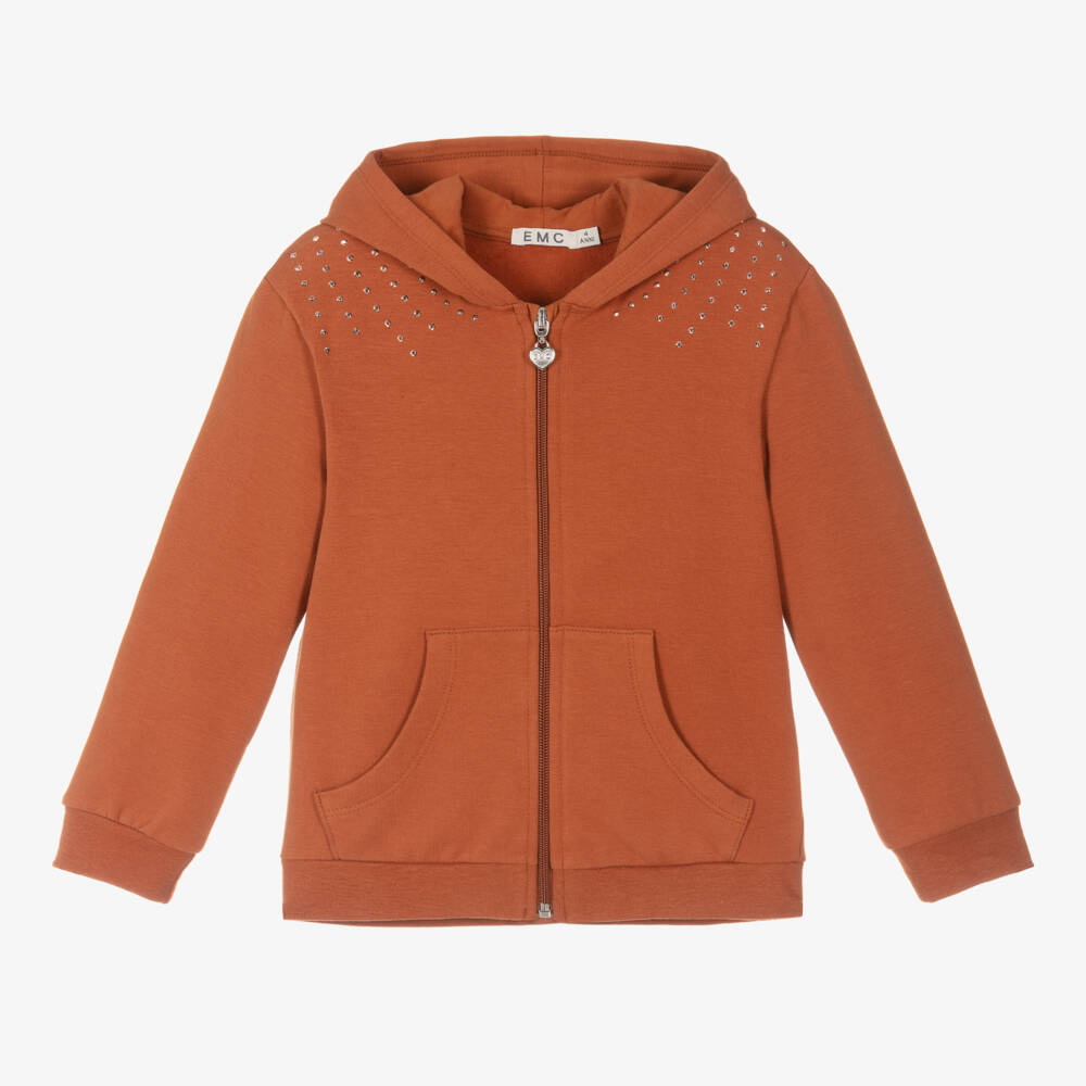 A cotton zip-up top for girls from Italian brand Everything Must Change, in deep orange. Made in super-soft jersey with a fleecy-feel underside, it has sparking silver studs across the shoulders for a girly look. This hoodie is designed with front pockets and a front zip fastening with a heart-shaped pull.