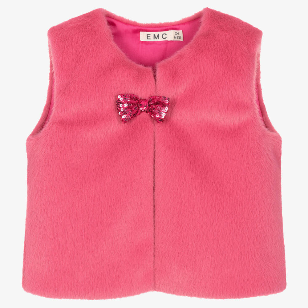 Pretty pink gilet for girls by Everything Must Change. Made in luxuriously soft plush faux fur, this fabulous outerwear style has a pink sequin bow appliqué on the front to add a touch of sparkle to the look. It is lined in a soft and silky fabric for effortless comfort, and fastens with a concealed button on the front.