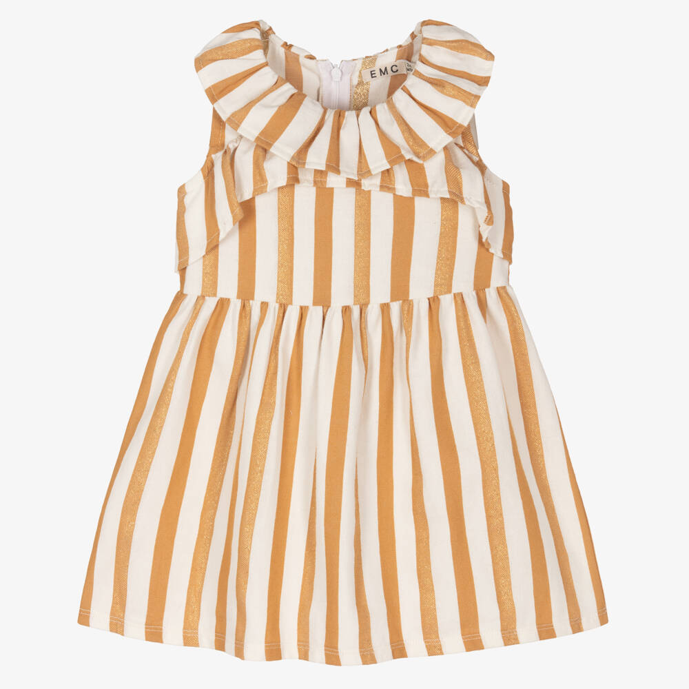 Ivory and beige dress for girls by Everything Must Change, made in super soft cotton with a metallic gold lurex weave for added sparkle. In an all-over striped design, it has a ruffled collar and a layered bodice. Effortlessly charming, it has a gathered waist and fastens with a concealed zip on the back.