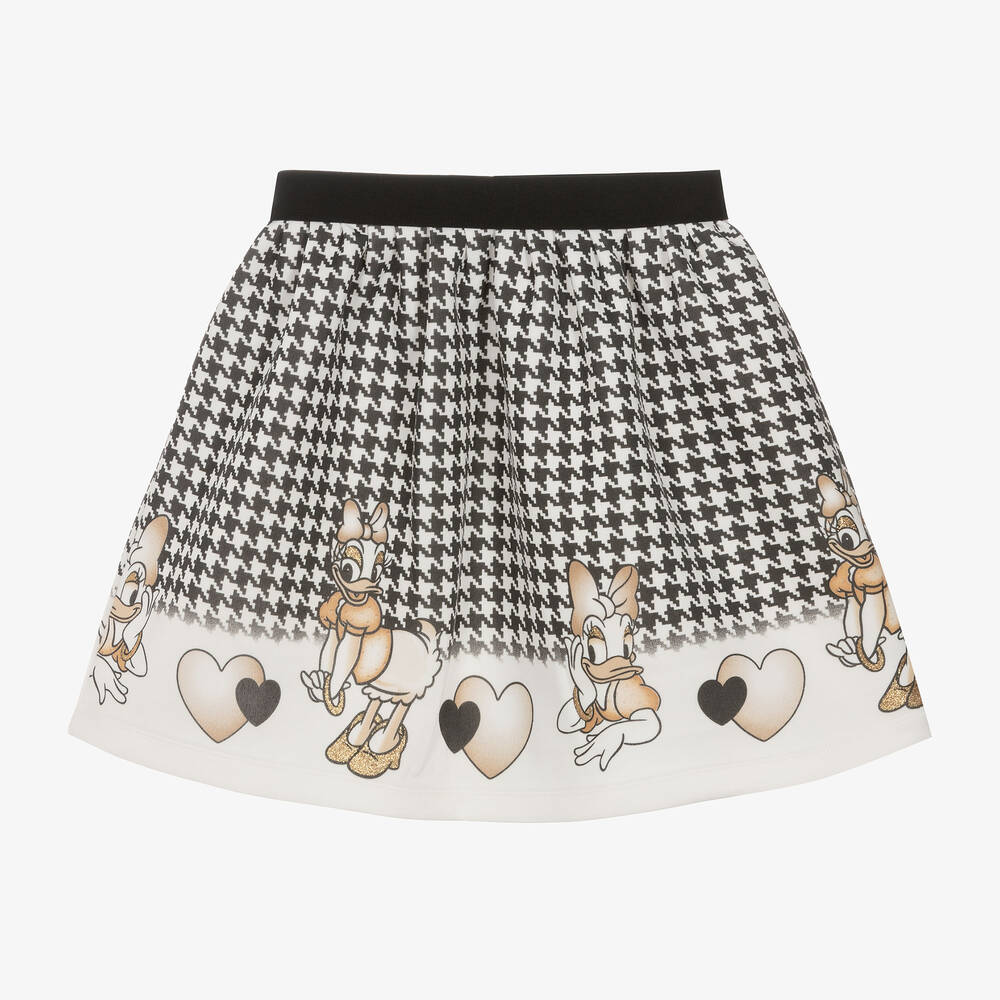 Part of the Disney capsule, this ivory and black skirt for girls is by Everything Must Change. Made in smooth and stretchy jersey, it has a lovely houndstooth pattern and is printed with cute Daisy Duck characters around the hemline with gold sparkly details. It has a black elasticated waistband for a comfortable fit.