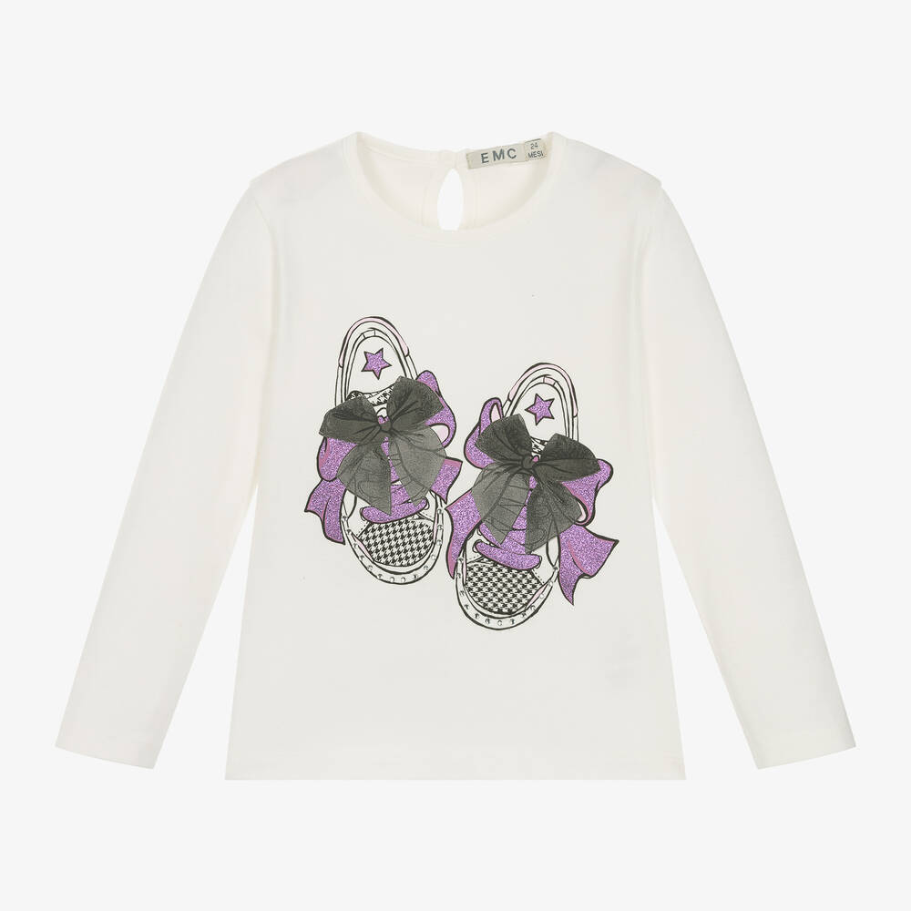 Ivory top for girls by Everything Must Change, made in soft and stretchy cotton jersey. A print of a cool pair of trainers can be seen on the front, with purple glitter accents and sparkling diamanté trims.