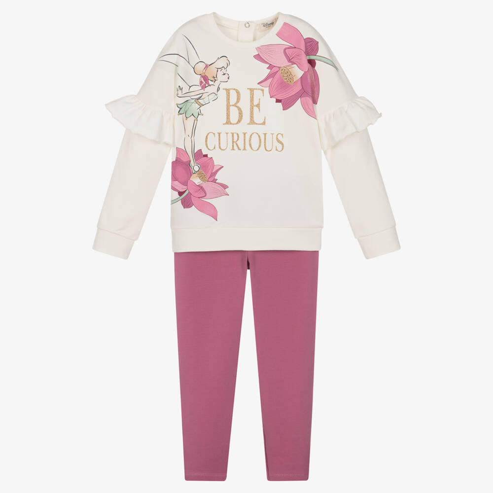 Ivory and purple Disney leggings set for girls, by Everything Must Change. Made in soft cotton jersey, the ivory crew neck has a playful pink Tinkerbell print on the front with 'Be Curious' in glamorous gold lettering. It fastens with easy-to-use poppers on the back and has pretty ruffle trims. It comes with dusky purple leggings to complete the casual, everyday look.