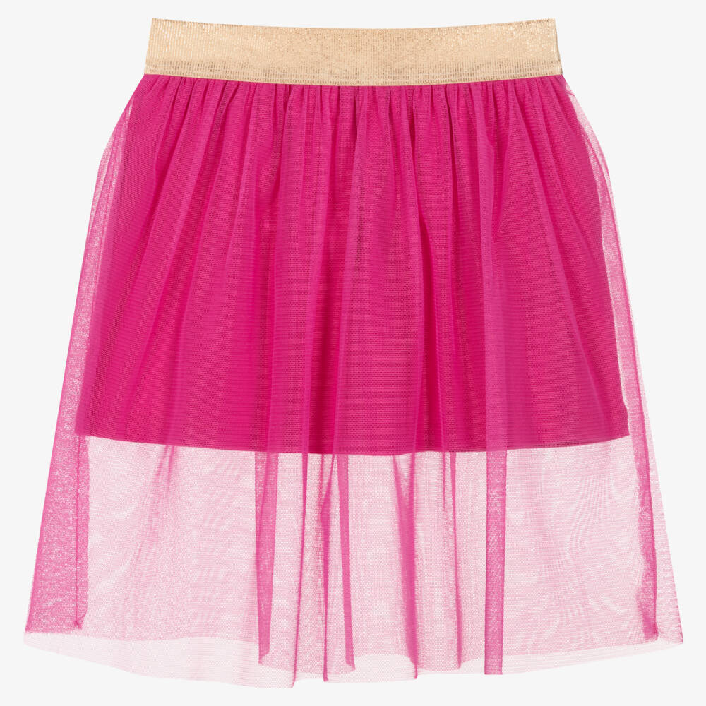 Lovely bright pink skirt for girls by Italian brand Everything Must Change. Made in a comfortable cotton jersey, it has a sheer pink tulle overlayer and a sparkly gold elasticated waistband.