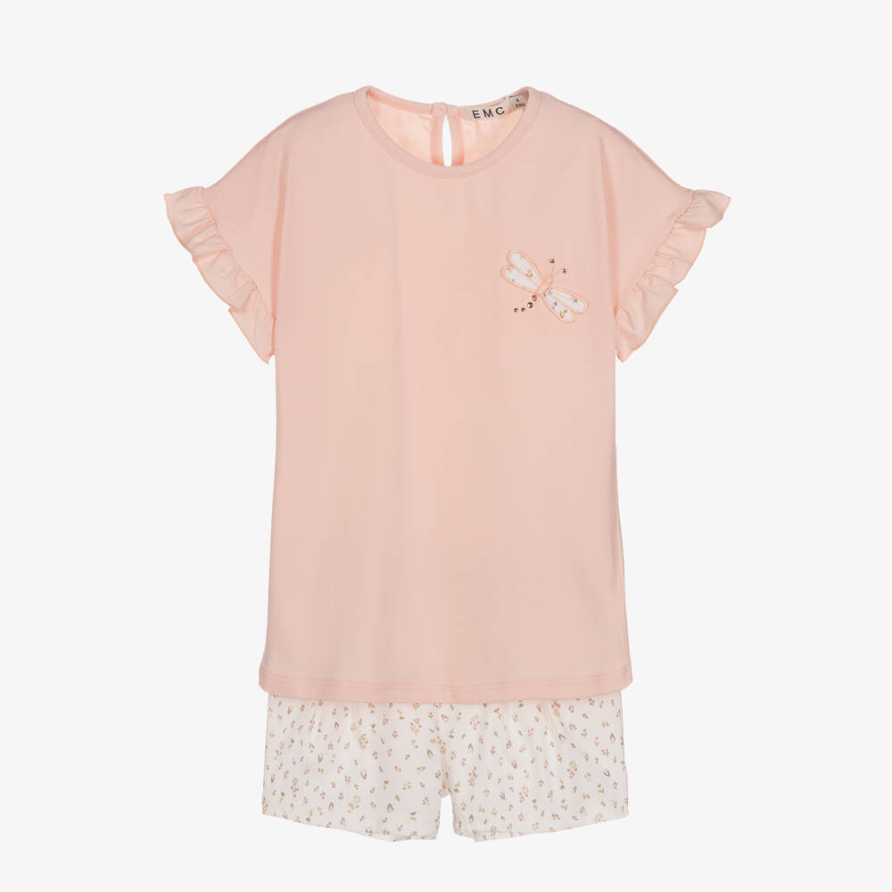 Pretty pink and ivory shorts set for little girls by Everything Must Change. The pink T-shirt is made in soft and stretchy cotton jersey. It has sweet ruffle trims on the sleeves and a floral patterned butterfly appliqué on the front trimmed with sparkly pink diamantés. There is a single button fastening on the back. The ivory shorts are made in a soft, lightweight cotton and viscose blend, with a lovely ditsy floral print. They have pleats on the front and a fixed bow trim on the front of the partially elasticated waistband.