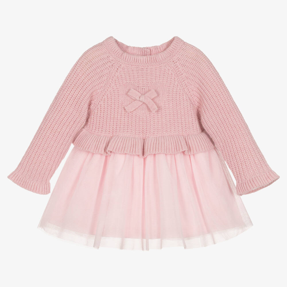 Adorable pink dress for little girls by Everything Must Change, knitted in a super soft wool blend with a hint of cashmere. It has a sweet knitted bow appliqué on the front and pretty ruffle trims. The mid-weight jersey skirt has a lovely pale pink tulle overlay and is fleecy inside for added warmth. This cosy dress fastens with diamanté buttons on the back.