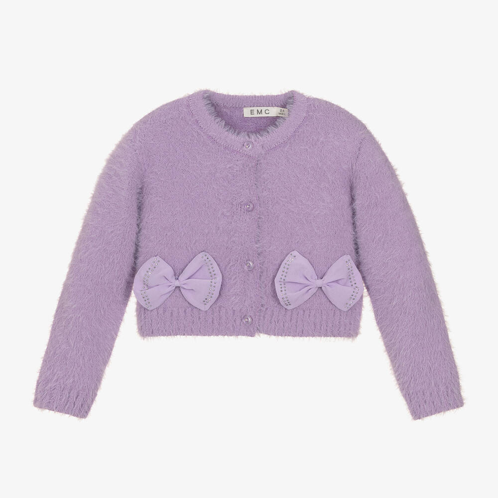 A gorgeous lilac purple long-sleeved cardigan for girls by Everything Must Change, made in a super soft and fluffy knit. This beautiful layering piece has decorative soft chiffon bows on the front detailed with shimmering diamantés. The button fastenings have an added diamanté for an extra touch of sparkle.