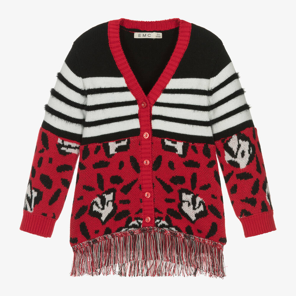 Girls red, white and black long-sleeved cardigan by Everything Must Change, with an abstract and stripe design. Made in a soft cotton and wool knit, this cosy piece has coordinating tassels trimming the hem. It has a V-neckline, stretchy ribbed cuffs and fastens with buttons on the front that are detailed with a little diamanté for added sparkle.