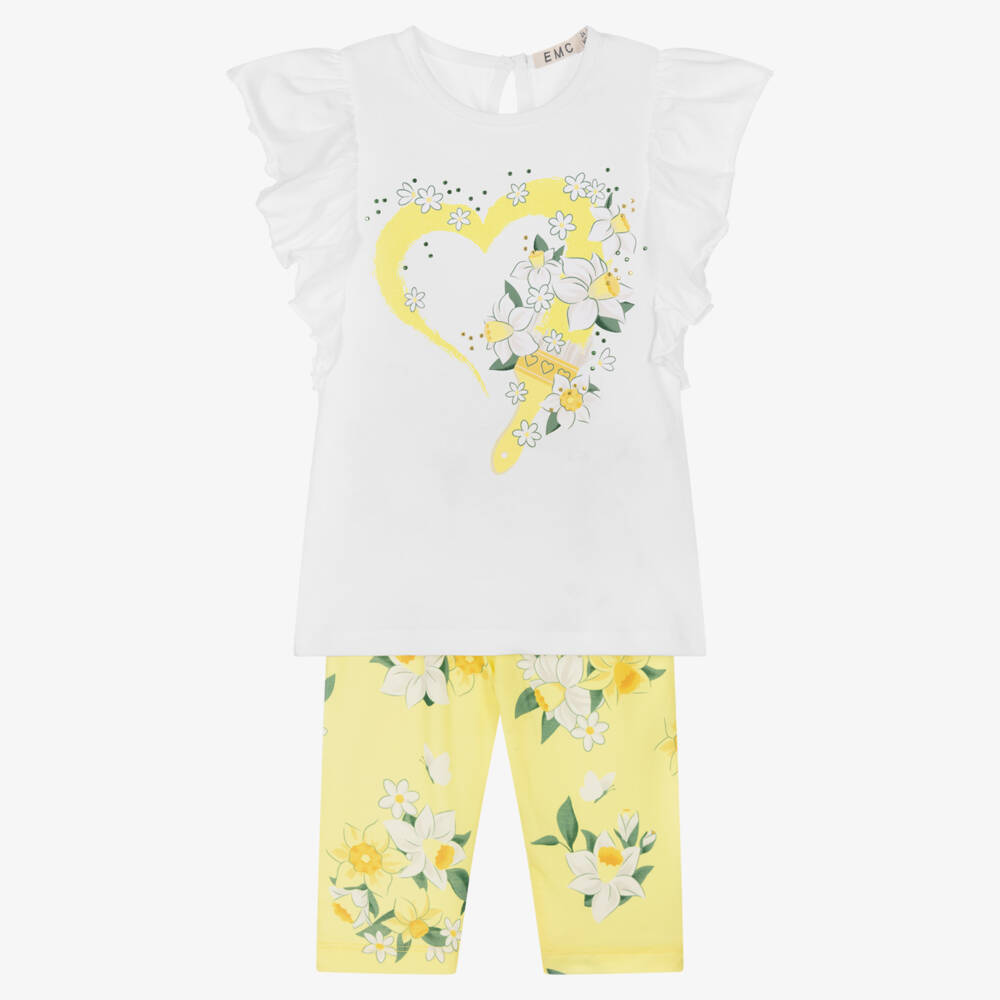 Delightful leggings set for girls by Italian brand Everything Must Change, made in soft, comfortable jersey. The white T-shirt has feminine ruffles over the shoulders, with a glittery yellow and green heart and daffodil print and sparkly studs. The cropped yellow leggings have an all-over daffodil print and a stretchy, elasticated waist.