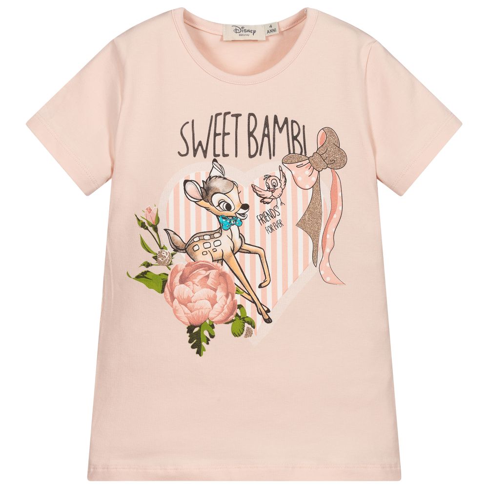Pale pink T-shirt for girls by Everything Must Change, made in soft and stretchy cotton jersey. There is a sweet Disney© Bambi print on the front with gold glitter and diamanté stud details.
