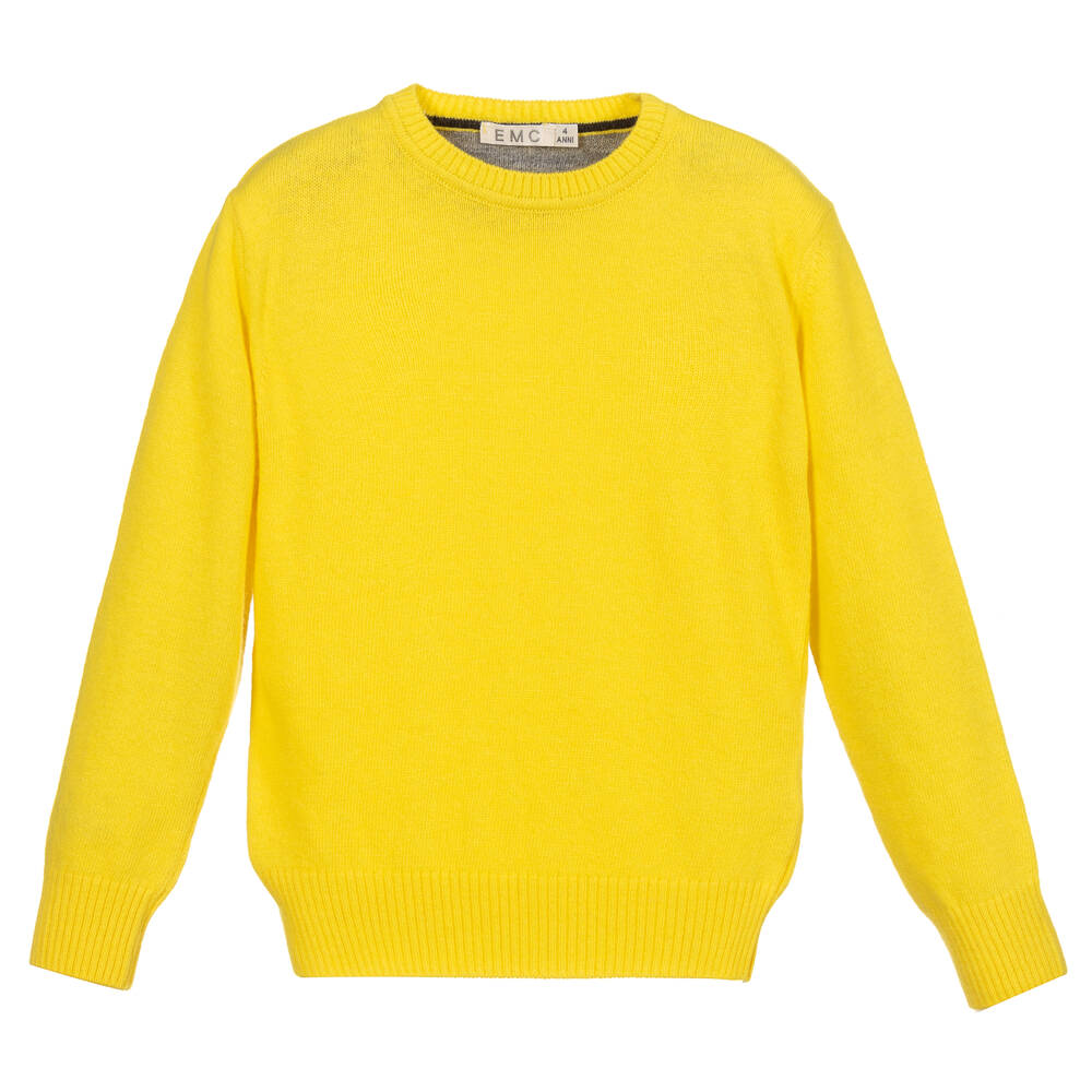 Yellow jumper for boys by Everything Must Change. It is made in a softly knitted wool and viscose blend with a luxurious touch of cashmere and has elbow patches in a grey striped knit.