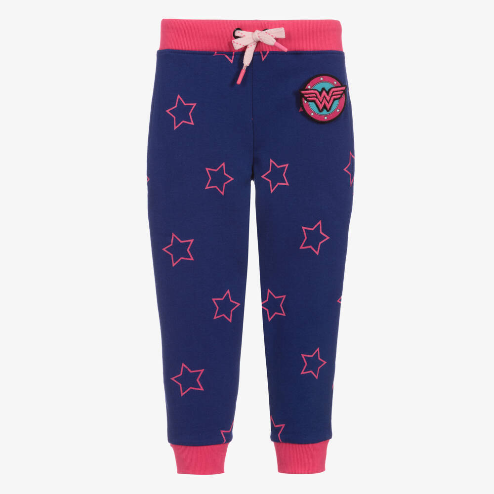 Blue joggers for girls by Fabric Flavours, with a pink star print. They have a removable Wonder Woman logo appliqué from DC Comics, Inc. on the front in pink and black. There is a useful drawstring waistband.