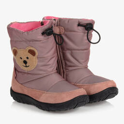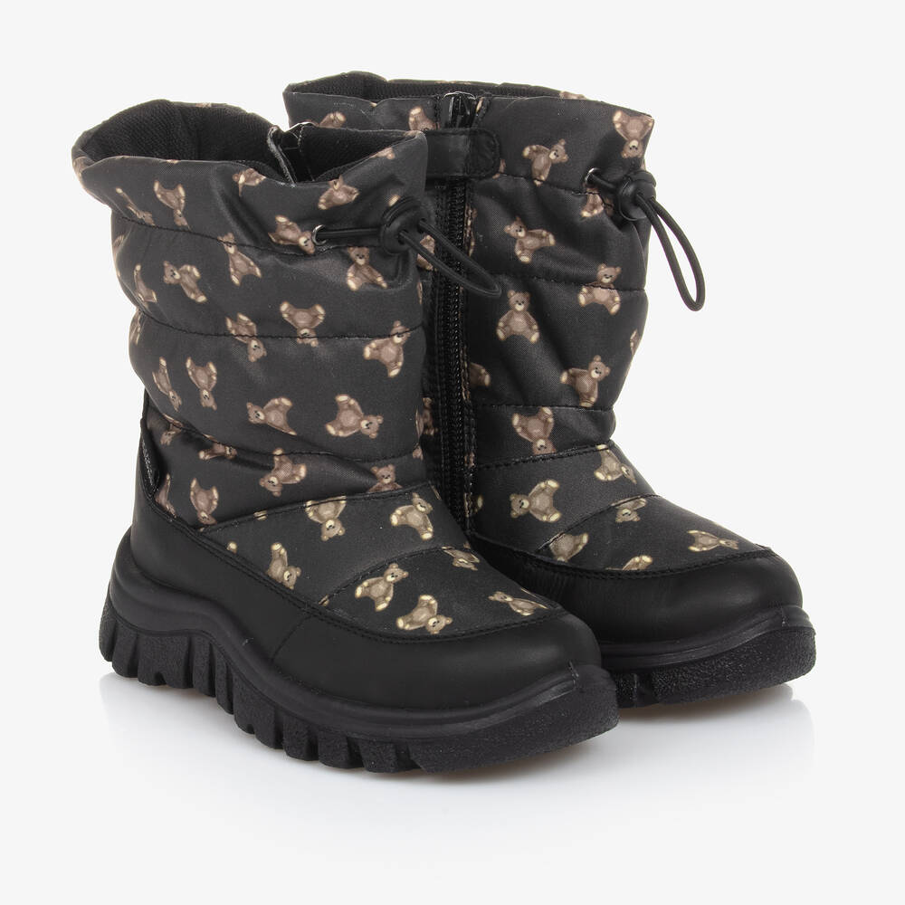 Black boots for little boys and girls from Falcotto by Naturino, with an adorable teddy bear print. Great for protecting little feet from rain or snow, these waterproof boots have smooth leather trims and a warm fleece lining. Fastening with a zip on one side, they have a toggle on the front to adjust the fit and a chunky non-slip rubber outer sole to improve grip on slippery surfaces.