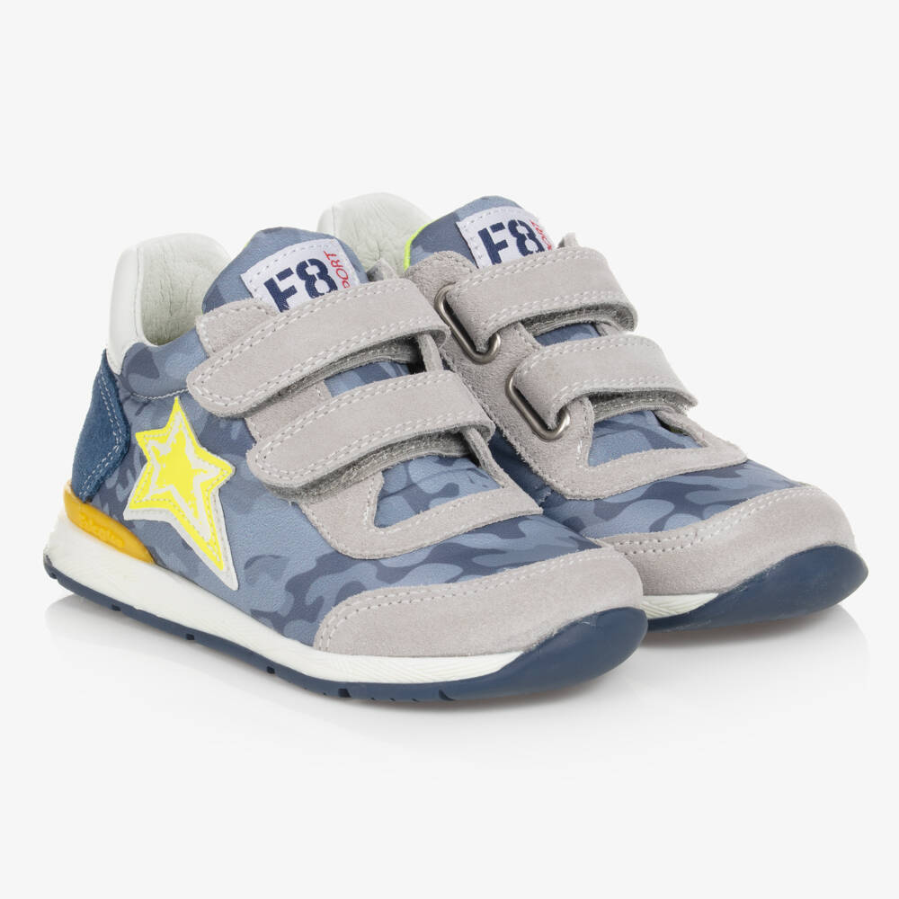 Cool trainers for boys from Falcotto by Naturino, with camouflage satin uppers and suede leather trim in grey and blue. This sporty shoe has logo branding on the tongue and heel, and a bold neon yellow star detail on the sides. Ideal for developing feet, they are lined in supple leather with reinforced heels for added support. They fasten easily with two velcro straps and have flexible non-slip rubber soles.