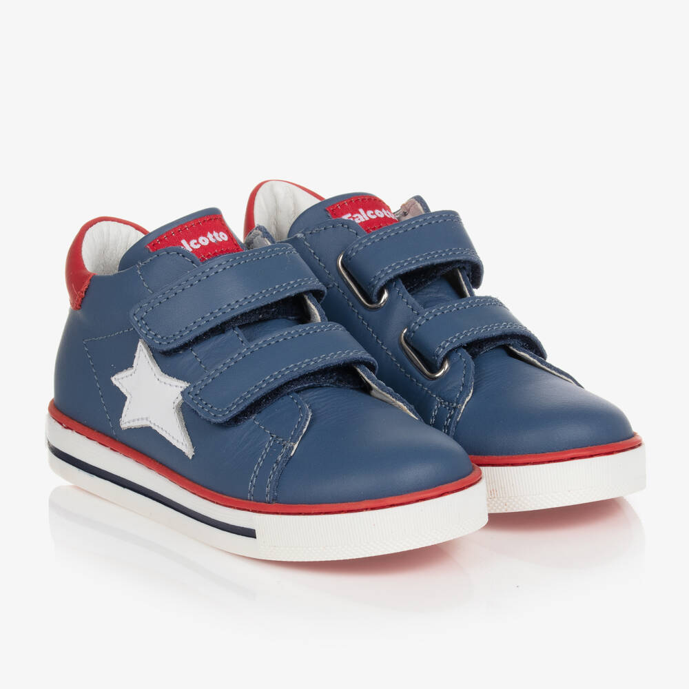 Boys blue leather mid-top trainers from Falcotto by Naturino, with velcro fastening straps. The uppers are super casual, with a white star on one side, a red heel tab and logo patch on the tongue. A padded leather insole provides lasting comfort, whilst a non-slip rubber outer sole shores up grip.