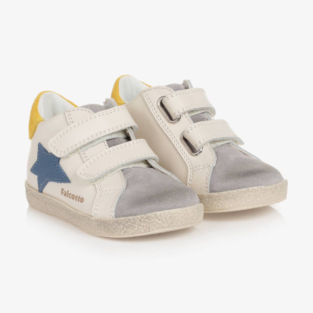 Ivory trainers for little boys by Italian brand Falcotto by Naturino, made in soft and supple leather. They have grey and yellow suede leather trim and a blue leather star appliqué on the side. For a comfortable fit, they fasten with double velcro straps and have a rubber sole for good grip. There is a special reinforcement on the heel to ensure just the right support for growing feet. For a cool finish, they are intentionally distressed on the toe and sole.