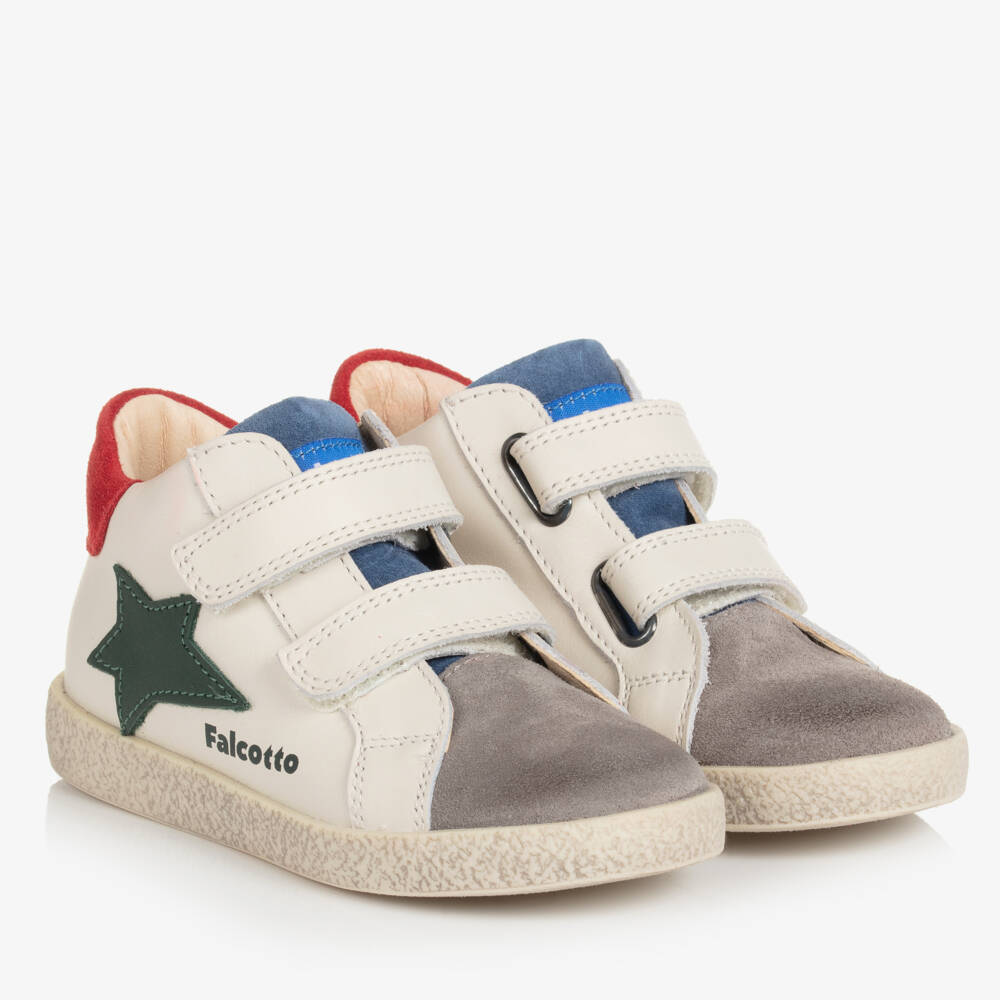 Handmade ivory and grey leather trainers for little boys by Falcotto by Naturino, with colourblock suede leather trims. Lined in cushioned leather on the heels for comfort, they fasten simply with velcro straps on the front. The brand's logo is printed on the sides in black and the rubber outer sole is ridged for good grip.