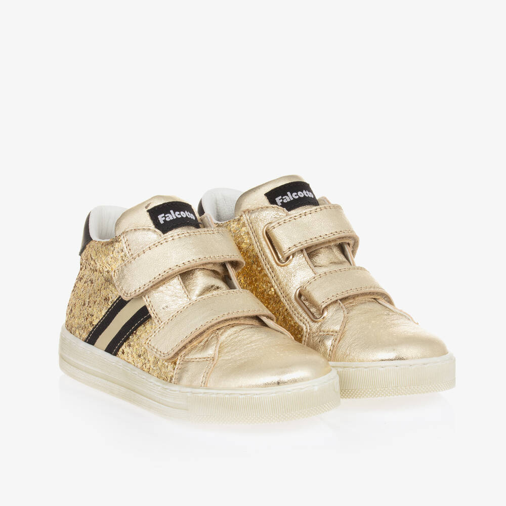 Glittery gold leather trainers for little girls by Falcotto by Naturino. These eye-catching shoes are lined in soft leather, with lightly padded insoles for comfort. They are trimmed with black and gold stripes at the side and the tongue has a logo patch for a branded finish. Fastening with practical velcro straps, they have a special reinforced heel for ankle support, with non-slip rubber soles for good grip.