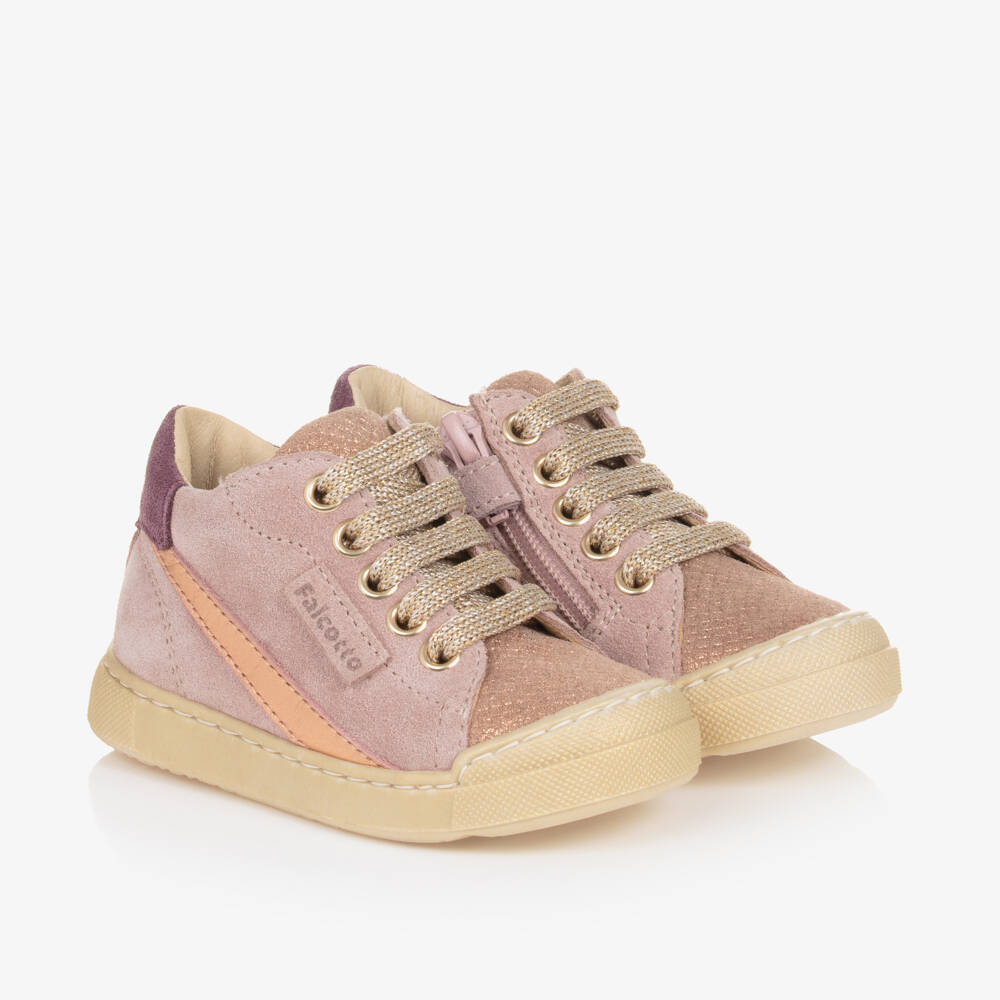 Adorable pink trainers for girls from Falcotto by Naturino, made from smooth leather suede. These pretty shoes have glittery and metallic rose gold trims, with sparkly gold laces fastening at the front. A zip fastens on the side for easy dressing, secured with a velcro tab to keep it in place. A smooth leather lining and flexible rubber outsole complete this shoe.