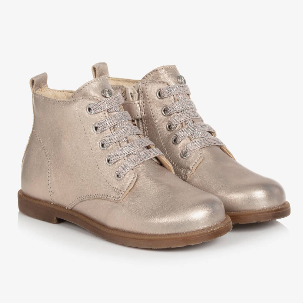 Lovely rose gold boots for girls by Falcotto by Naturino, handmade in soft and supple leather. Fastening with a zip and velcro strap on the sides, these stylish boots have shimmering faux laces on the front for a cute style. They have a cushioned leather lining and insole for maximum comfort. The tan brown outer sole is rubberised and ridged for great grip.