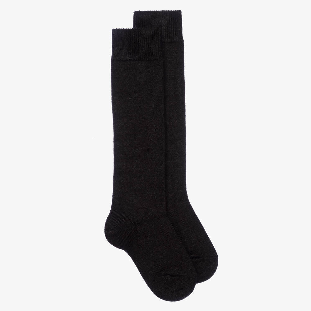 Girls and boys dark grey knee-high socks from Falke, made in a luxuriously thick and stretchy wool blend, with a soft cotton inside. They have comfortable ribbed cuffs, with reinforced stress zones for added durability.