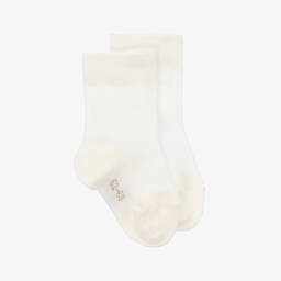 Super soft ivory socks for baby boys and girls by Falke, knitted from soft and stretchy sustainable cotton, with a logo on the underside.