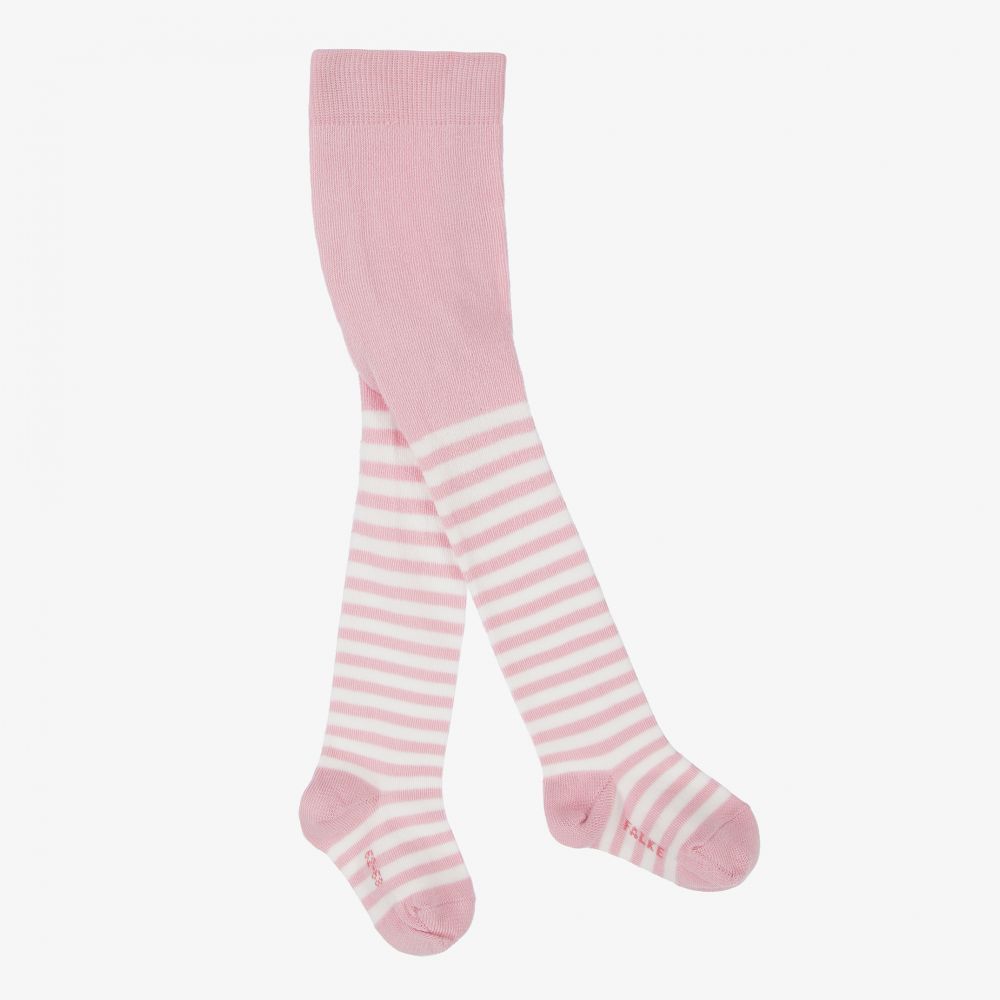 Pink and white striped tights for baby girls by German brand Falke. They are made in soft and stretchy cotton, with the brand's logo name on the foot.